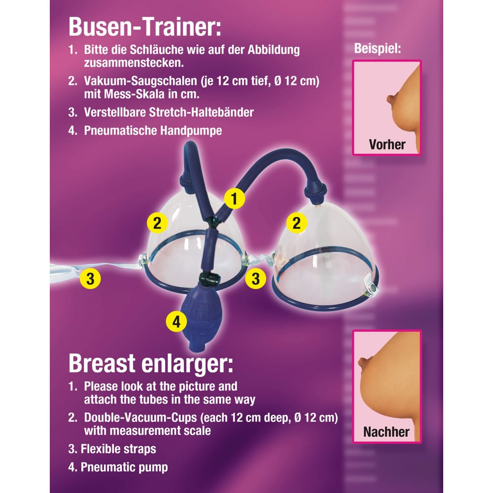 Place with adjustable stretch band and produce vacuum with hand-pump. The boobs will become larger at once!